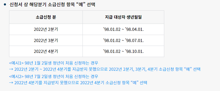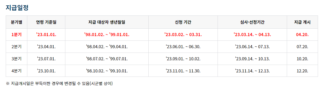 - 2023년 1월 1일 기준 만 24세 청년만 지난 분기 미신청분 추가 신청 가능(소급 신청 분기 거주 요건 미충족 시 소급 지급 불가)