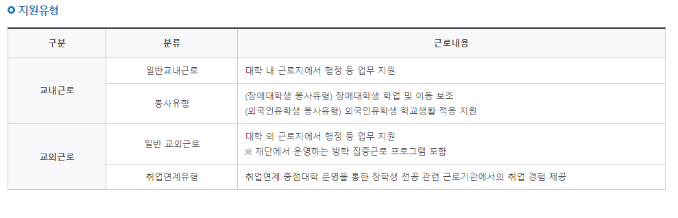 - 장애 대학생 봉사 유형, 장애인, 다자녀 가정(대한민국 국적의 자녀가 3명 이상인 가정)의 미혼 자녀, 다문화 및 탈북가정 자녀, 국가유공자, 국가보훈자, 부모 중 한 분이 장애인 중증 환자인 학생, 학업 육아 병행 학생, 아동복지 시설 위탁가정 등의 보호가 종료된 학생은 학기당 520시간 이상 근로 가능