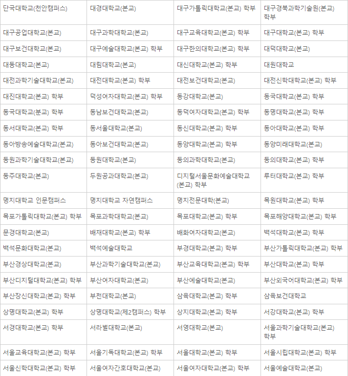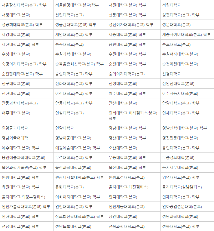 - 장애인, 다자녀가정 자녀, 다문화, 탈북가정 자녀, 국가유공자, 국가보훈자, 부모 중 한 분이 장애인 중증 환자인 학생, 학업 육아 병행 학생, 아동복지시설, 위탁가정 등의 보호가 종료된 학생