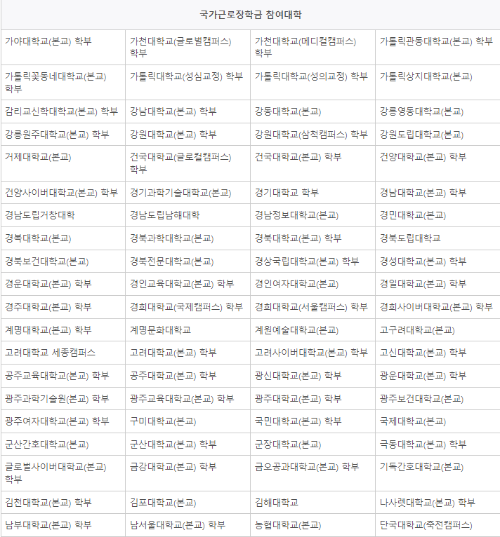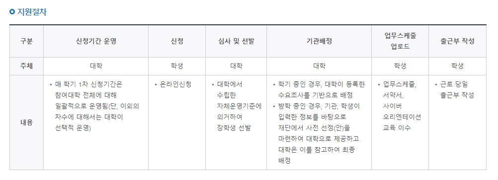 - 희망 근로자 신청 기간 : 하계방학 5월 중, 동계방학 11월 중(희망 근로지 신청 기간은 매 학기 상이)