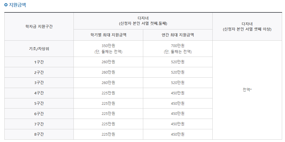 1) 개요 : 다자녀 가구의 등록금 부담 경감을 위해 지원되는 장학금