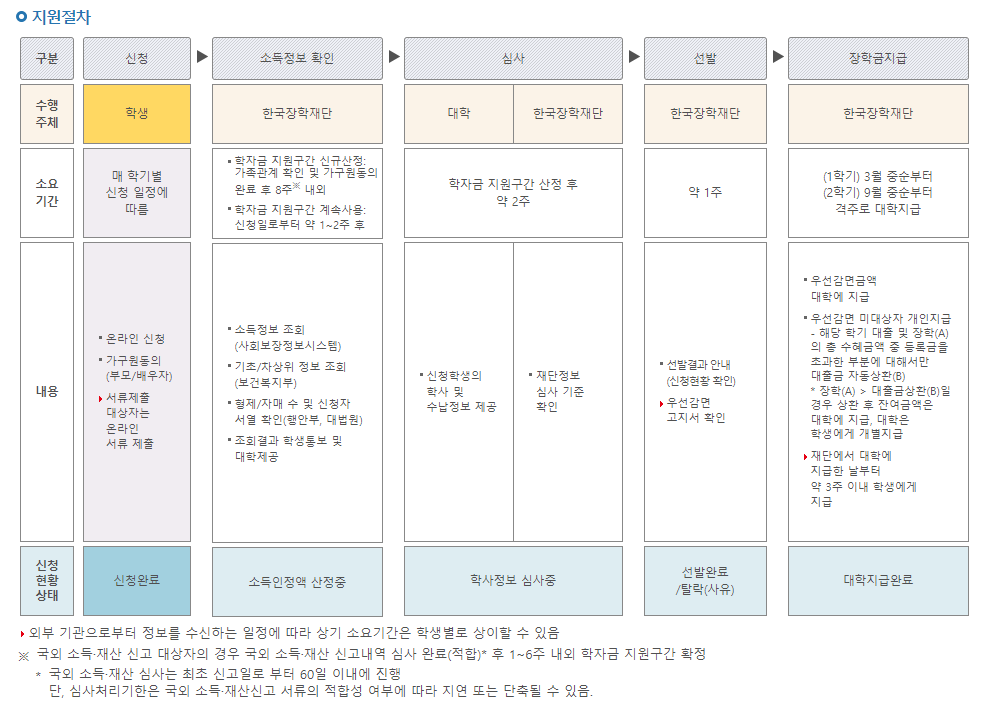 - 학자금 지원 구간 적용 : 긴급 경제적 위기가구 학생, 봉사 유형 및 취업 연계 유형 근로학생은 학자금 지원 구간 적용 배제 가능