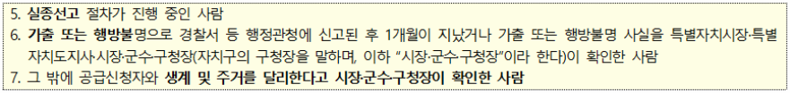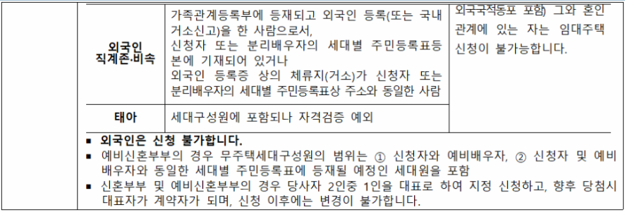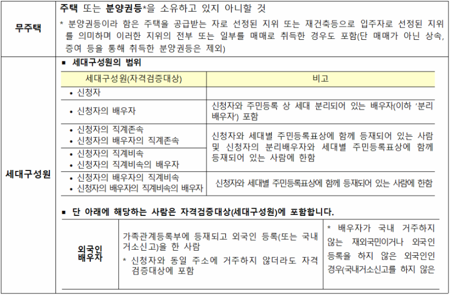 해당 우선 공급 신청자는 신청자와 동일한 세대별 주민등록표상에 등재되어 있지 아니한 배우자 및 배우자와 동일한 세대를 이루고 있는 세대원의 무주택 및 소득자산 요건은 보지 않습니다(분리 배우자와 분리 배우자와 함께 등재된 세대 구성원은 자격 검증 대상 제외). 단, 세대 구성원 중 국민기초생활 보장법 시행령 제2조 2 제2항 제5호부터 제7호에 해당하는 자는 해당 세대 구성원에서 제외되며 신청자 본인이 입증서류를 제출해야 합니다.