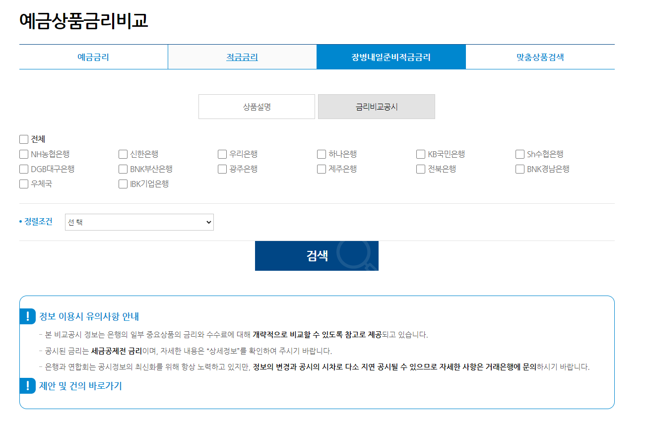 은행연합회 소비자 포털 홈페이지 접속 후, 금리/수수료 비교공시 > 예금상품 금리 비교 > 장병내일준비적금 금리 클릭