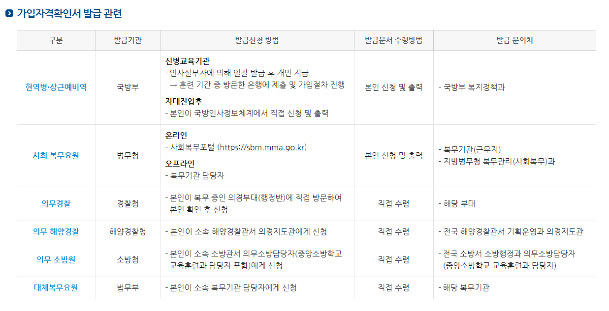 1) 가입 대상: 현역별, 상근예비역, 의무경찰, 해양 의무경찰, 의무소방원, 사회복무요원
