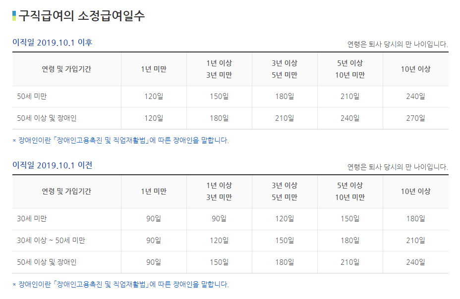 2019년 10월 1일 이전의 지급 기간은 90일에서 240일이었으나 2019년 10월 1일 이후 개정 고용보험법이 적용되면서 그 기간이 120일에서 최대 270일로 확대되었으며 지급 대상의 연령 구분은 3단계에서 2단계로 단순화해. 고용보험 가입 기간이 10년 이상인 사람의 경우 50세 미만이면 240일 동안, 50세 이상이면 270일 동안 실업급여를 받을 수 있습니다.