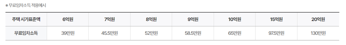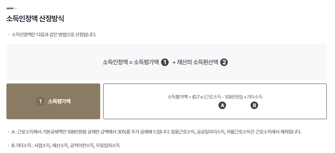 - 사업소득은 기타 사업 소득과 임대 소득의 합이며 재산소득은 이자소득과 연금소득의 합, 공적 이전소득은 각종 법령의 규정에 의해 정기적으로 지급되는 각종 수당, 연금, 급여, 기타 금품을 말하며 일시금으로 받는 금품은 재산으로 산정됩니다. 또한, 무료 임차 소득은 자녀 소유의 고가 주택에 거주하는 본인 또는 배우자에 대하여 임차료에 상응하여 소득으로 인정하는 금액으로, 본인 또는 배우자의 주민등록상 주소지 주택이 자녀 명의이고 시가 표준액 6억 원 이상인 경우 연 0.78%의 소득이 적용됩니다.