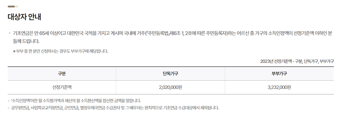 만 65세 이상, 대한민국 국적을 가지고 있으며 국내에 거주하는 어르신 중 가구의 소득 인정액이 선정 기준액 이하인 분들께 드리고 있으며, 부부 중 한 분만 신청하시는 경우도 부부가구로서 기초노령연금 수급 자격에 해당하여 연금을 지급받을 수 있습니다.