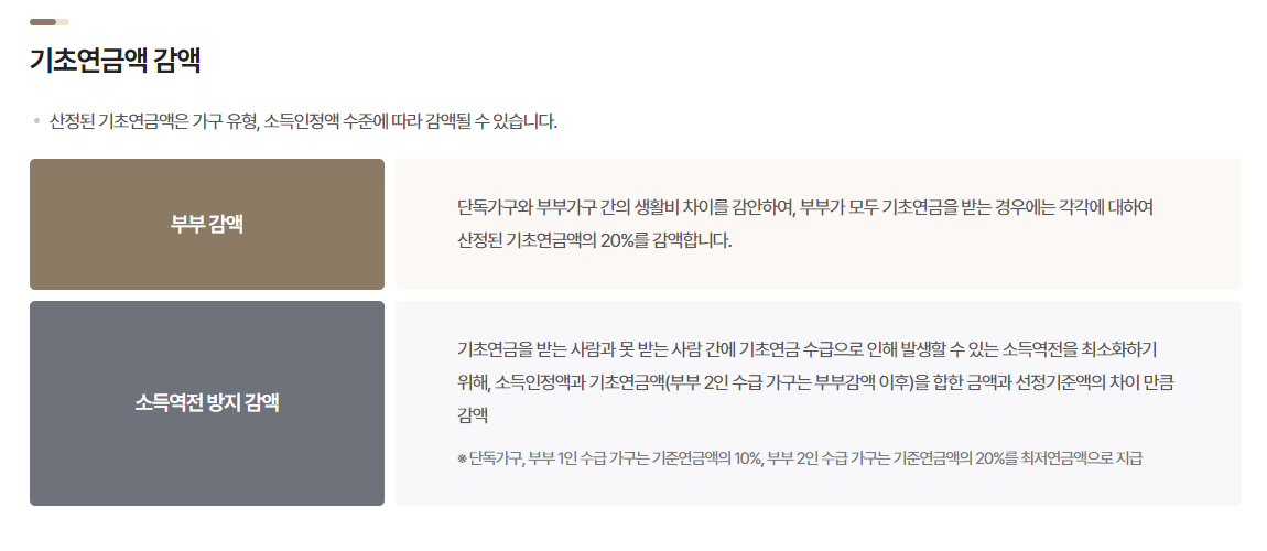 산정된 기초연금액은 가구 유형과 소득 인정액 수준에 따라 감액될 수 있습니다.