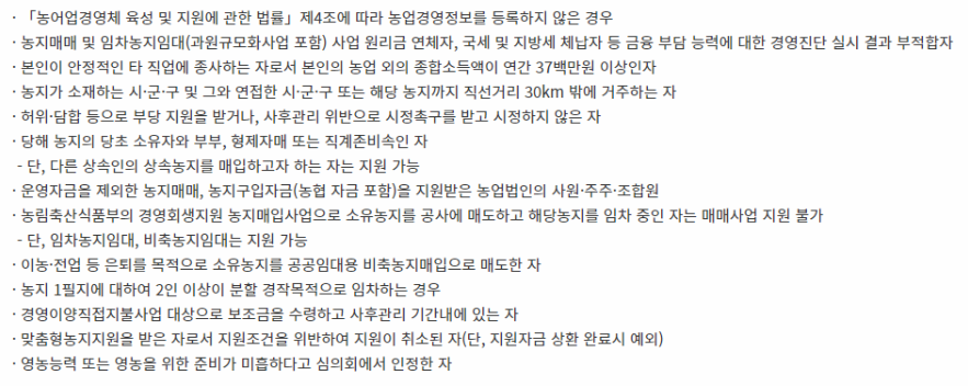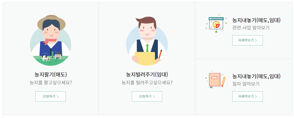 - 매입 가격 : 농지소유자와 협의하여 결정하며 농지를 매입한 농업인 또는 농업 법인은 최초 2년간 벼 외 타 작물 재배 의무