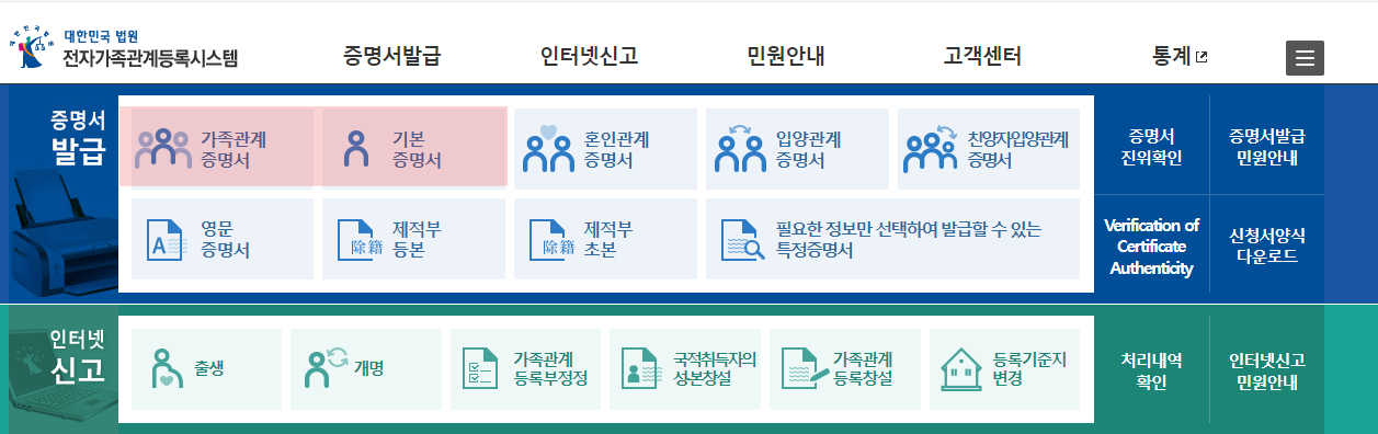 - 가족관계증명서 일반, 기본증명서(특정)의 경우