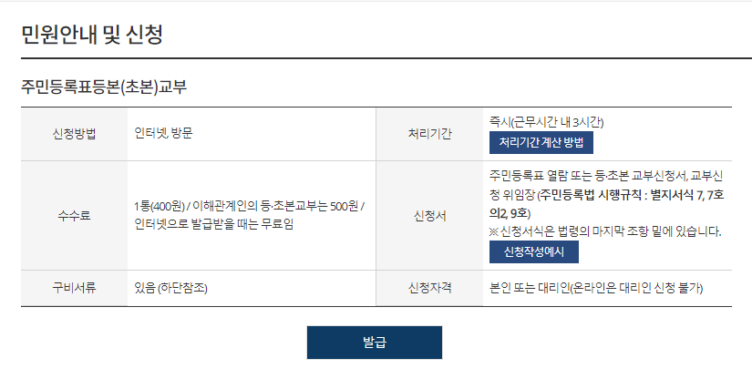 주민등록초본의 경우 정부 24(https://www.gov.kr/portal/main)를 통하여 발급 신청이 가능하시면 본인 인증서를 통한 로그인이 필요합니다. 방문 신청의 경우 거주지 행정복지센터 방문 시 1통에 400원의 수수료를 지불하고 발급할 수 있고 무인 발급기를 통하여 지문인식 후 발급받을 수 있습니다.