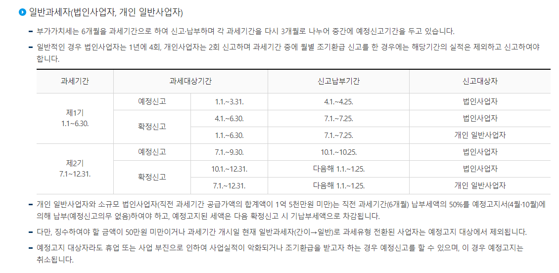 - 개인 일반사업자와 소규모 법인사업자는 직전 과세기간 납부세액 50%를 예정 고지서에 의해 납부해야 하고, 부가세 예정 고지된 세액은 다음 확정신고 시 기납부세액으로 차감됩니다.