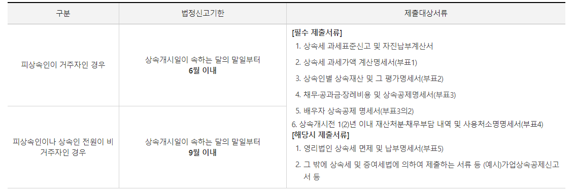 - 예시 2 : 피상속인이나 상속인 전원이 비거주자인 경우 상속개시일이 속하는 달의 말일부터 9월 이내에 신고서를 제출해야 하며 2023년 3월 10일인 경우 신고 기한은 2023년 12월 31일 됩니다.