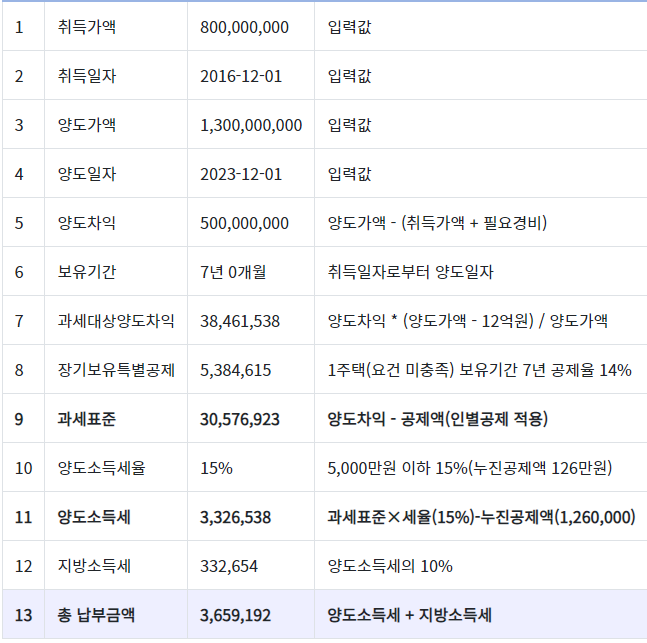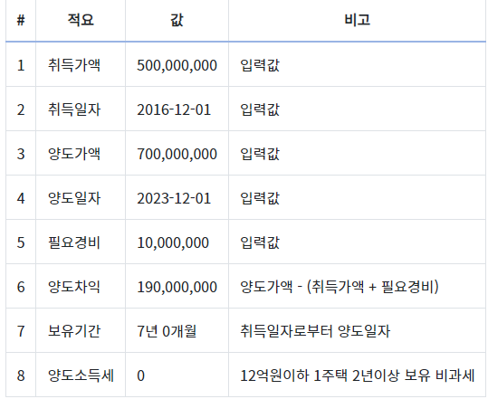 1) 12억 원 이하 : 취득가액 5억 원(취득일 2016년 12월 1일), 양도가액 7억 원(양도 일자 2023년 12월 1일), 필요경비 1,000만 원일 경우