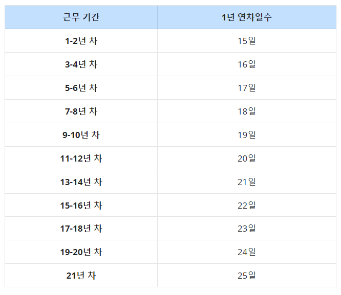 앞서 휴가 일수는 최대 25일이 한도이며 근속 22년 차부터는 계속 근로하여도 25개만 지급됩니다.