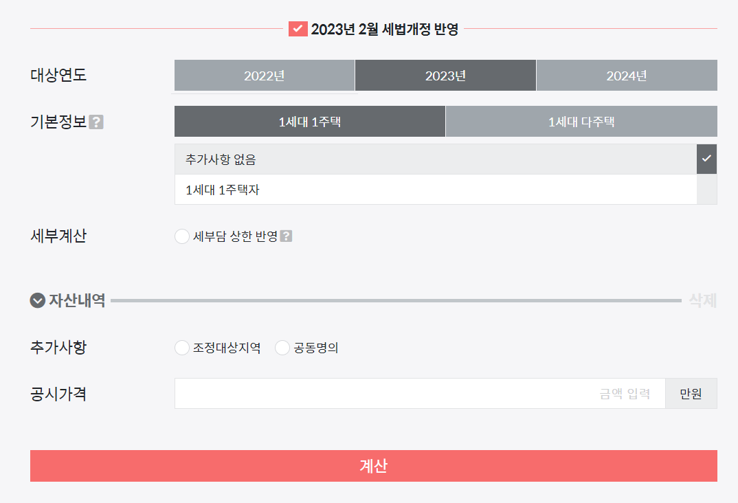 2023년 2월 세법개정 반영하여 대상 연도 2023년도 선택 후 기본 정보(1가구 1주택, 1세대 다주택) 설정 및 자산 내역(추가사항, 공시가격) 입력 후 계산을 클릭하시면 자동 계산됩니다.