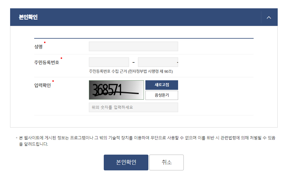 진료받은 내용 조회를 위해서는 본인확인용 인증서가 필요하며, 본인확인을 위해 성명과 주민등록번호, 숫자 입력 후 하단의 본인확인 클릭 후 인증서 로그인을 진행하시면 됩니다.
