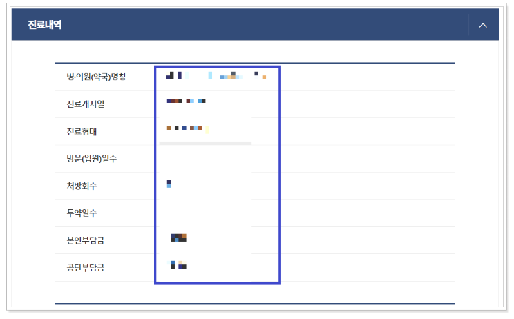 - 민감한 상병이나 사생활 침해 우려가 있는 정신과, 산부인과, 비뇨기과 등의 상병은 제공되지 않으며 열람 또는 발급을 원하시는 경우 신분증을 지참하신 후 가까운 공단 지사에 방문하시면 받으실 수 있습니다.