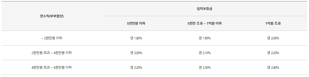 금리는 부부합산 연 소득에 따라 구분됩니다. 부부합산 연 소득이 2,000만 원 이하라면 1.5%, 2,000만 원 초과 4,000만 원 이하는 1.8%, 4,000만 원 초과 6,000만 원 이하는 2.1%의 금리로 대출받을 수 있으며 저소득층과 한부모가구, 장애인, 노인 부양, 다문화, 고령자 가구, 다자녀 가구, 25세 미만 청년 가구 등에 금리우대가 적용됩니다. 금리우대는 연 소득에 따라 4,000만 원 이하 기초생활수급권자 차상위계층 연 1.0%, 연 소득 5,000만 원 이하 한부모가구 연 1.0%, 장애인과 노인 부양 다문화 고령자 가구 연 0.2% 적용되며 중복 적용은 불가합니다.