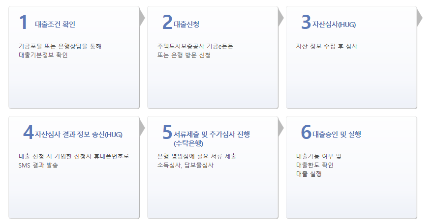 4) 대출 제외 조건 : 주택도시기금 대출이나 은행권 전세자금 대출 또는 주택담보 대출을 이용하고 있으면 중복 대출을 받을 수 없고 신용 정보상 특수기록이 남아있는 경우나 대출 접수일 현재 공공임대주택에 입주하고 있는 경우에도 대출 불가