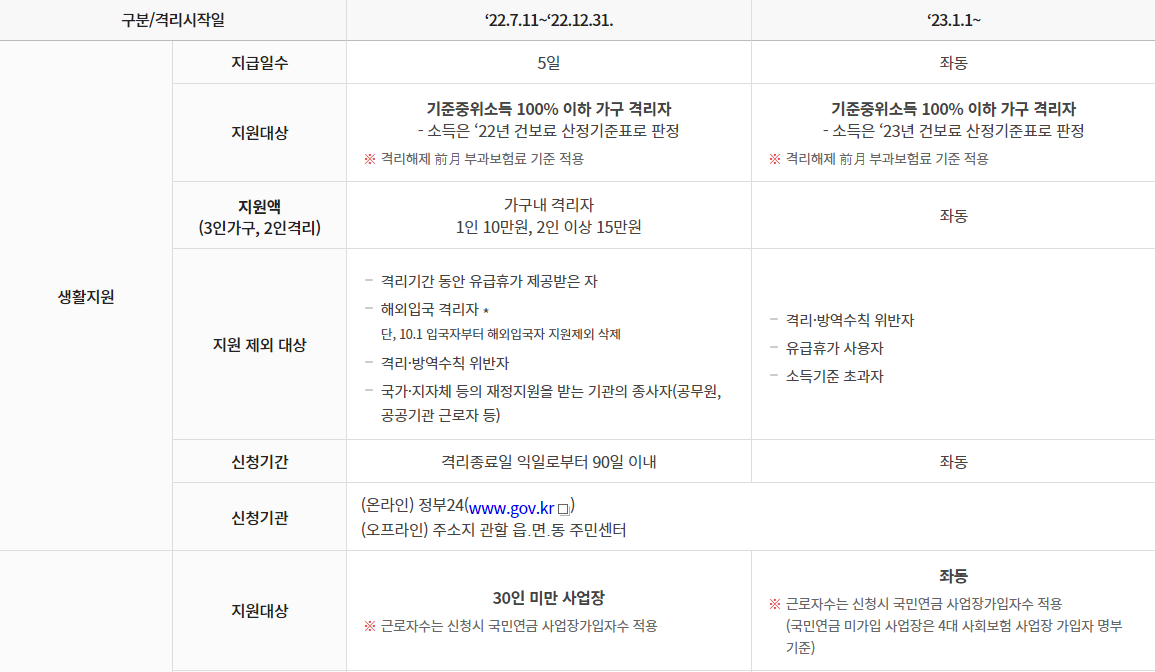 감염병의 예방 및 관리에 관한 법률에 따라 입원 격리 통지서를 받은 사람으로 입원, 격리자 가구의 소득이 기준중위소득 100% 이하 금액에 해당하는 가구이며 2023년 1월 1일 이후로 입원, 격리 통지를 받은 사람은 원칙적으로 별도 기재가 없는 한 입원, 격리 통지서상 격리 시작일을 격리 통지일로 보게 됩니다. 따라서 검체 채취를 12월 31일, 격리 통보(전화, 문자, 문서 등) 1월 1일 이후 통지로 보아 개정 기준이 적용됩니다. 따라서 2021년 12월 31일 이전 입원, 격리 통지된 사람은 종전 고시 및 지침을 기준으로 코로나 생활지원금이 적용됩니다.