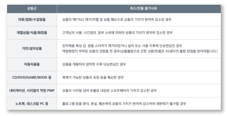 취소 및 반품 불가 사유는 하단과 같으며, 아래 리스트를 참고하신 후 불상사가 없도록 주의하시길 바랍니다.