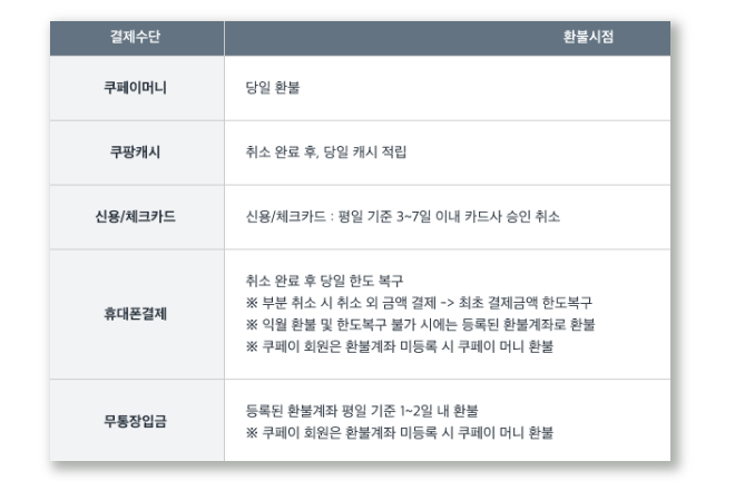 환불 완료기간은 하단과 같으며, 결제수단에 따라 달라집니다.