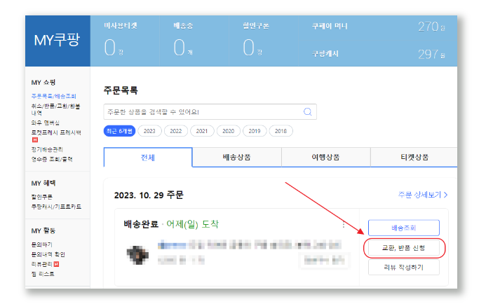 마이쿠팡 > 주문목록 페이지 접속 후 "교환, 반품 신청" 버튼을 클릭하면 기사님께서 직접 방문 수거 후 환불이 완료됩니다.