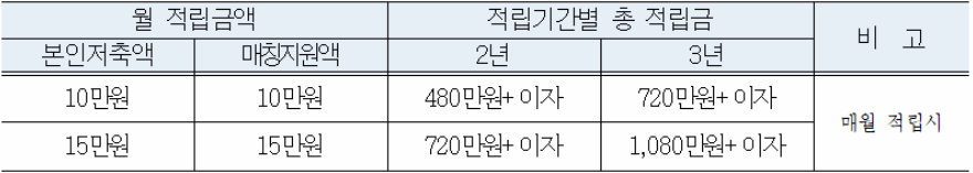 적립금의 경우 100% 매칭 지원으로 본인이 저축한 금액에 두 배가 적립되며 2년간 10만 원 저축 시 본인 납입액 240만 원에 지원금 240원으로 480만 원 + 이자를 받을 수 있고 15만 원의 경우 720만 원(360만 원 + 360만 원) + 이자, 3년 가입 시 10만 원의 경우 720만 원(360만 원 + 360만 원) + 이자, 15만 원의 경우 1,080만 원(540만 원 + 540만 원) + 이자를 만기 시 수령하게 됩니다.