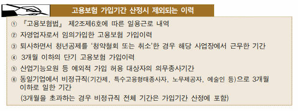 - 최종학교 졸업(이수 또는 수료) 후 고용보험 총가입 기간이 12개월 이하인 자. 단, 아래 표 고용보험 이력은 가입 기간 산정 시 제외