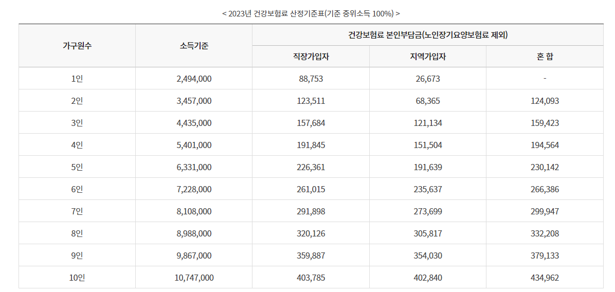 - 2023년 건강보험료 산정기준 표(기준 중위소득 100%)